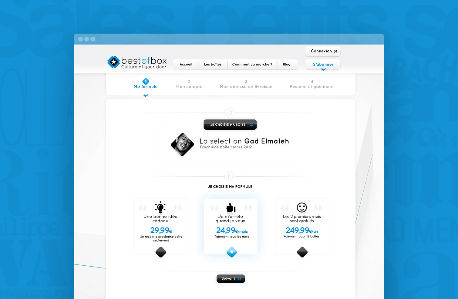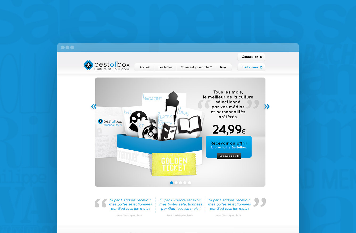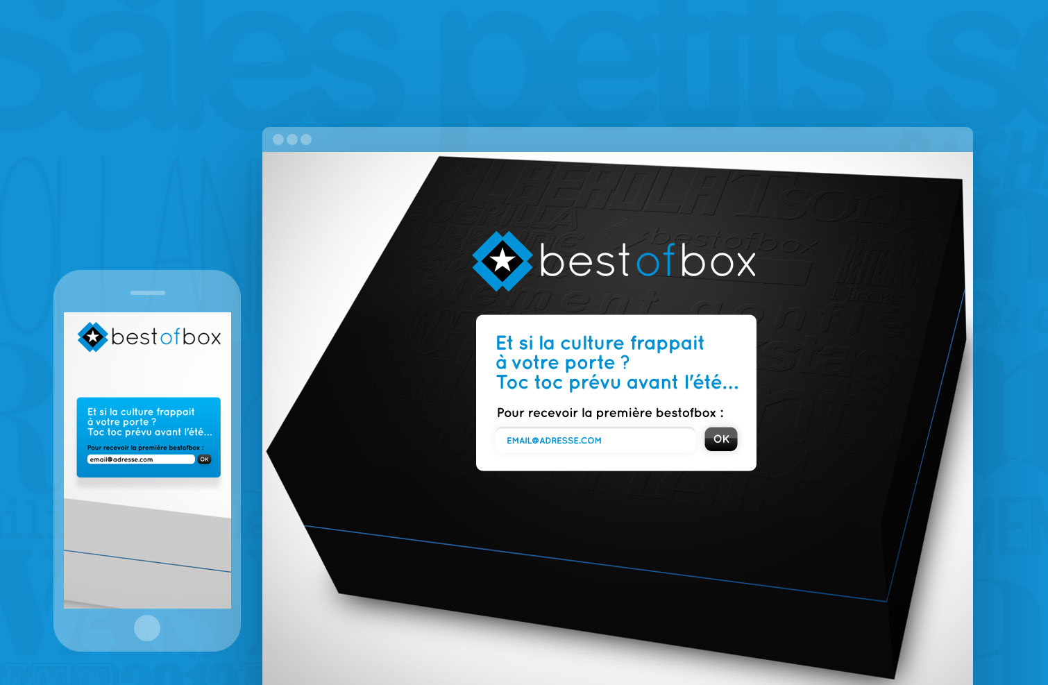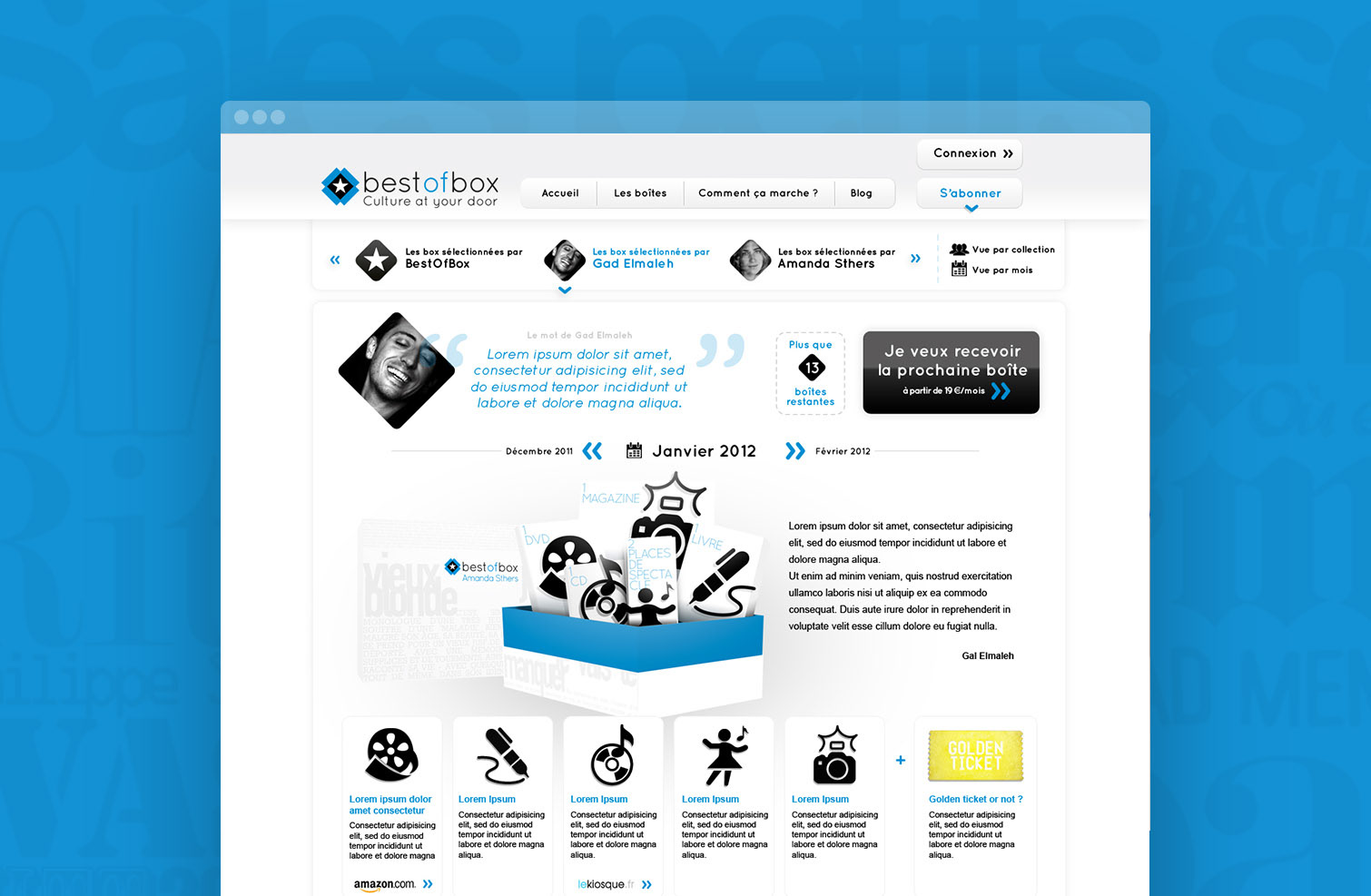 Box culturelle avec un partenaire différent chaque mois. Conception de la boîte et direction artistique de la charte graphique et du site internet.